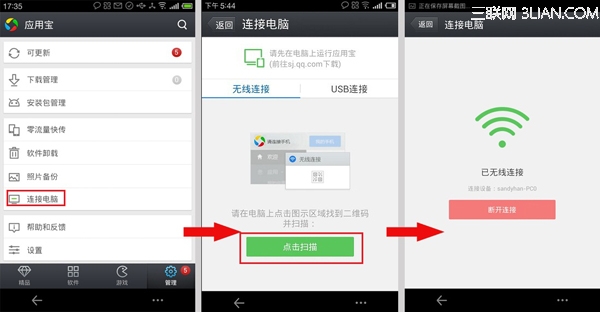 4、打开手机上已安装的完整版应用宝,选择”管理”—》“连接电脑”功能,进入后选择无线连接中的“点击扫描”,扫描电脑上的二维码成功后就可以连接手机和电脑啦!