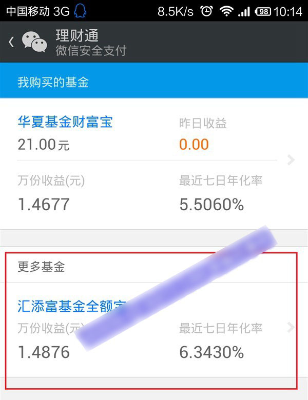 2、之后进入“我购买的基金”底部的更多基金中,就可以看到“汇添富基金全额宝”,这个就是微信理财通里面的“全额宝”哦,如下图所示: