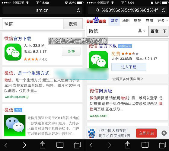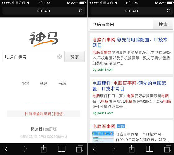 通过个人体验,笔者发现UC神马搜索结果与百度差不多,不仅可以搜索新闻资讯,还可以搜索APP应用等,以下是笔者对UC神马搜索与手机百度搜索结果对照,如下图所示: