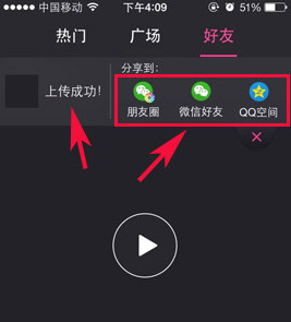 拍摄完成后,注意要先将视频上传,成功之后才能看到分享按钮。根据我们想要分享的平台来选择“朋友圈”“微信好友”“QQ空间”等。