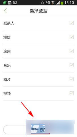 2)在旧手机上选择需要传输的数据,闪连可以传输“联系人”、“短信”、“应用”、“音乐”、“图片”、“视频”,选择完成之后点击“开始迁移”,然后手机会自动的帮你查找手机。(如下图所示)