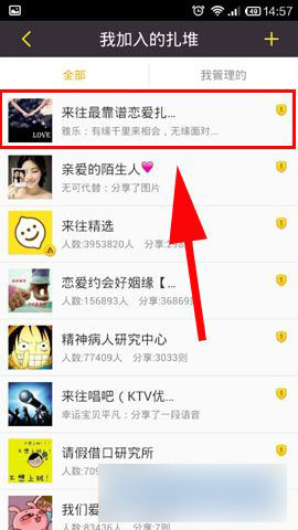 2)然后点击屏幕右上方进入【我加入的扎堆】,进去以后点击你想要签到的扎堆进去。(如下图所示)
