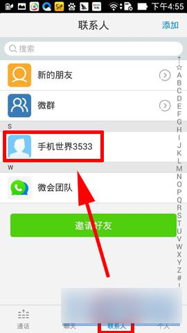 1)打开微会,点击下方【联系人】,选择要进行视频聊天的朋友。(如下图)