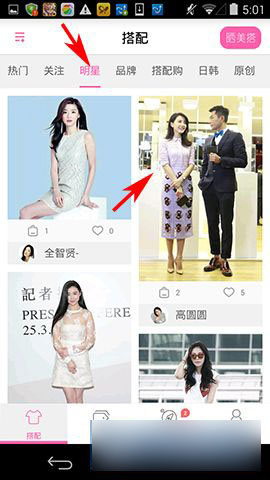 1)打开【穿衣助手】,点击【搭配】,选择你要搭配的明星、品牌等。(如下图所示)