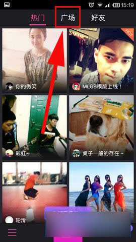 1)首先在手机桌面打开【美拍】,然后点击屏幕上方【广场】。(如下图所示)