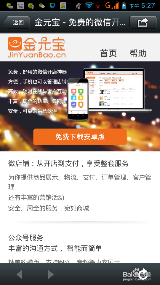 第一步,下载金元宝 微店 客户端,在百度中检索 检索 金元宝开店, 扫描下载二维码,打开页面如下。