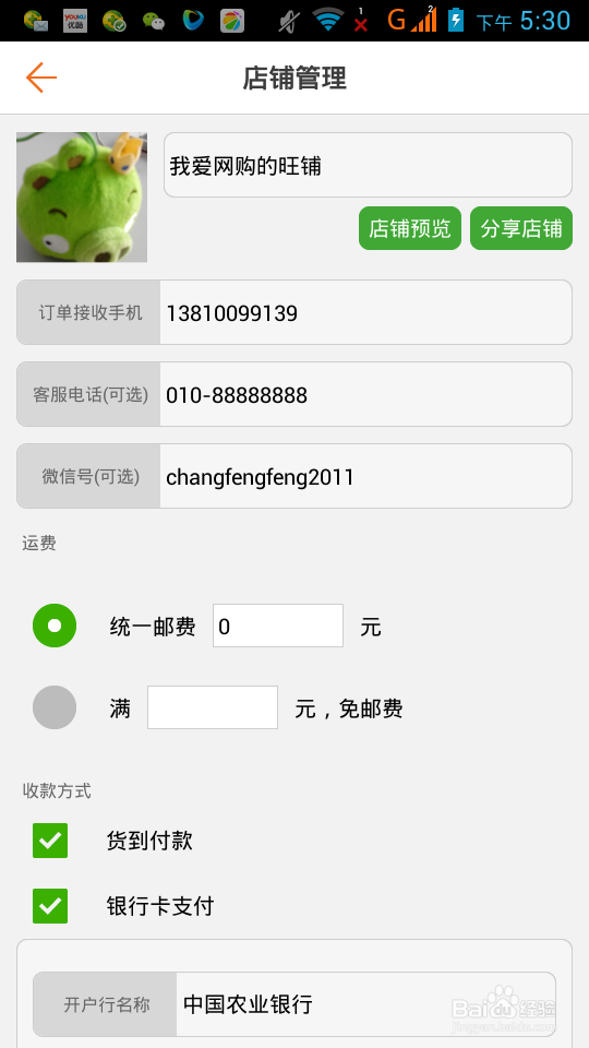 第三部,设置微信店铺,填写店铺名称,修改店铺头像,填入收款信息