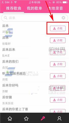 1)首先打开移动练歌房,点击【麦克风图像】,点击上方【搜索歌曲】,进入界面输入歌曲,点击【搜索】。(如下图)