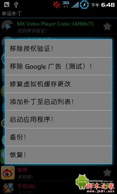 2、选择要破解或者移除广告的的程序(需要破解的才有效,别给我什么QQ也来破解以下啊,)长按,震动弹出下面的菜单,做出相应的选项就好了。