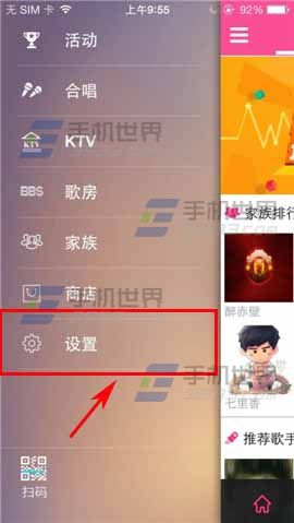 1)首先打开移动练歌房,在左上方点击【三横】,点击【设置】。(如下图)