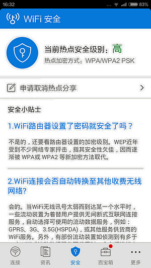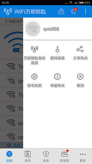 连上免费wifi后,可进行自动连接、分享热点、信号检测、举报热点等功能。