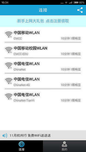 免费程度:号称免费使用三大运营商WIFI,同样需要购买或者做部分任务获得畅豆