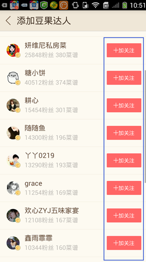 豆果美食采用大图推荐时令食谱,打开APP即呈现“看上去很美”的美食,令人食欲大增。用户点击图片即可通过食谱了解做法,并通过其结构化数据食谱,轻松掌握烹饪技巧,让美食“做的也很美“。它将美食菜谱、社区互动、美食画报、云计算数据存储整合为一体,囊括超过 10 万道菜谱。内容包含八大菜系、西餐、小吃、饮品、烘焙、海鲜、料理等等,只有你想不到,没有找不到!它还集成了一键分享功能,可以实时与好友分享精美内容,那么豆果美食手机版如何添加美食达人?下面小编就给大家详细介绍下。