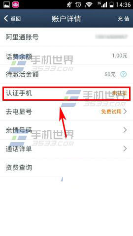 1)首先先打开阿里通电话,进去之后点击【当前余额】,然后点击【认证手机】。(如下图)