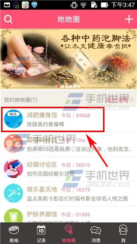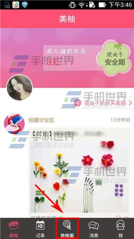 1)打开美柚,点击【她她圈】,选择一个圈子。(如下图)