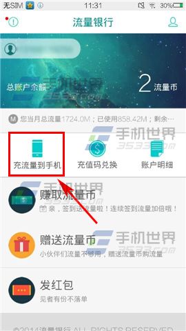 1)打开【流量银行】,点击【充流量到手机】。(如下图)