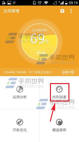2)弹出选择后点击【应用管理】,接着点击【内存加速】。(如下图)