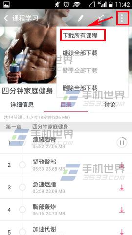 2)然后点击课程,进去之后点击右上角的【三点】弹出提示后点击【下载所的课程】就可以了。(如下图)