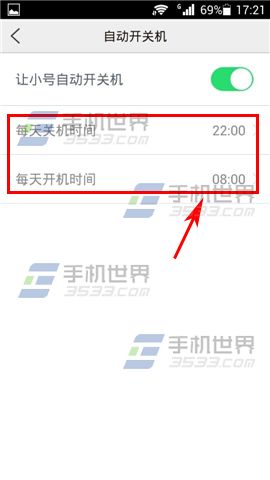 3)把【让小号自动开关机】选项打开,然后再设置每天定时开关机的时间就可以了。(如下图)