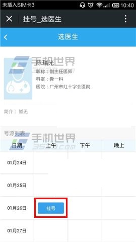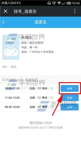 5)接着选择一个时间段点击右侧的【挂号】,在号源列表里,看到有【挂号】按钮的才可以进入挂号哦,点击它即可预约成功啦。