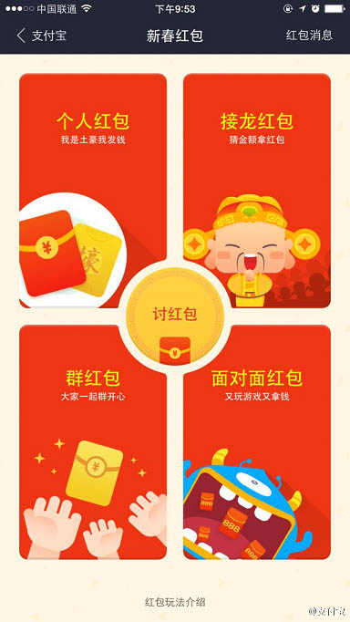 此次支付宝红包共提供了5种玩法,分别是“个人红包”、“群红包”、“接龙红包”、“面对面红包”和“讨红包”。除具备微信红包基础的定向、群发功能外,最大的特点就是互动性强。