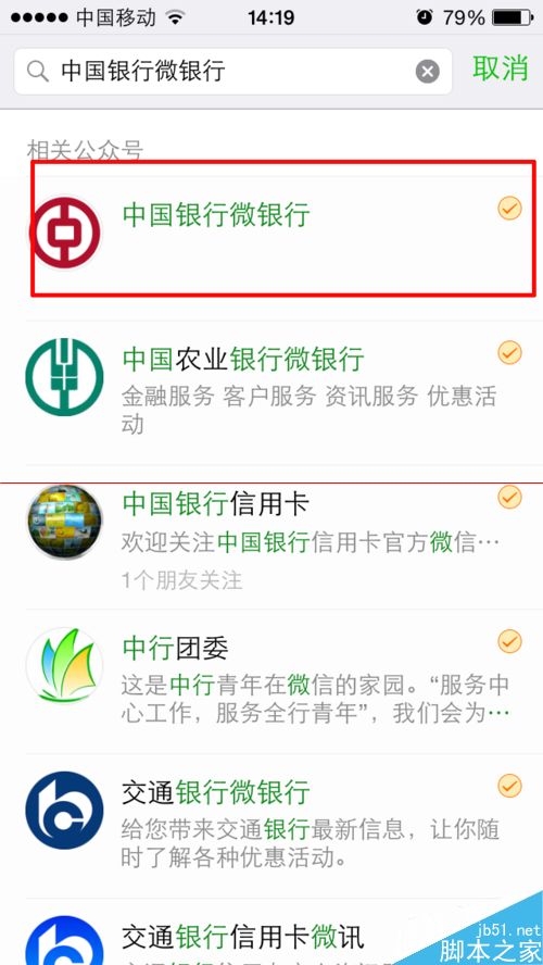 3、点击搜索,输入中国银行微银行后搜索,选择中国银行微银行并点击