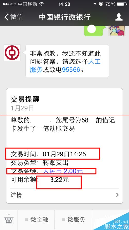 6、此时一旦你中国银行的金额有变动,你的微信就有信息提醒,交易时间,交易金额,余额多少。