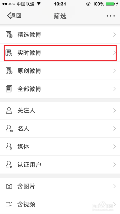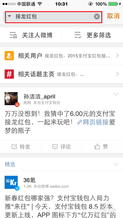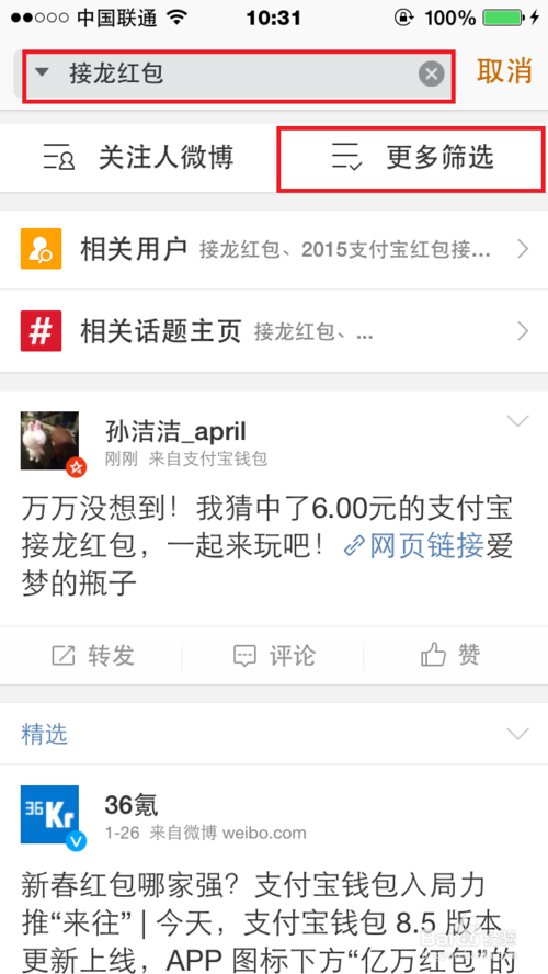 5、进入筛选界面,点击【实时微博】,进入最近红包接龙的转发信息页面。