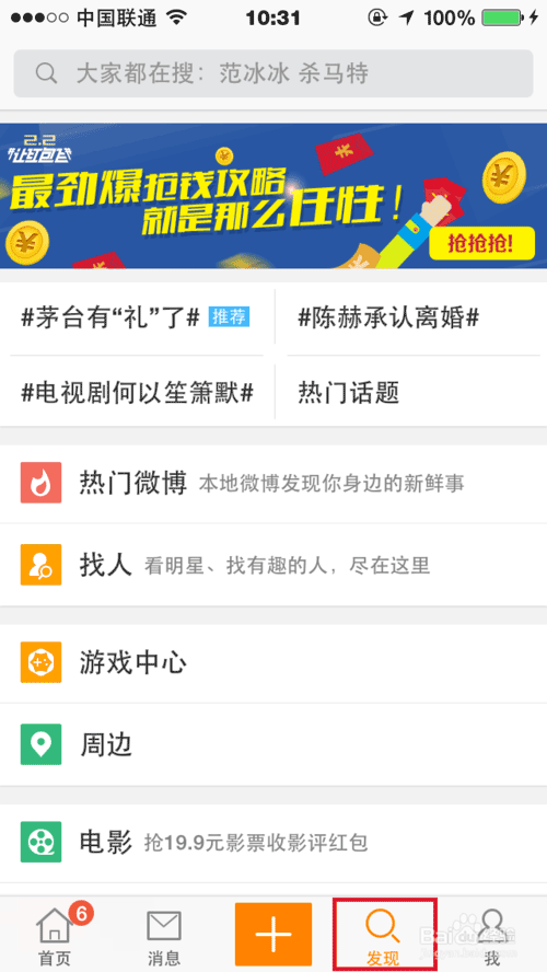 2、进入微博页面之后,点击【发现】进入搜索页面。