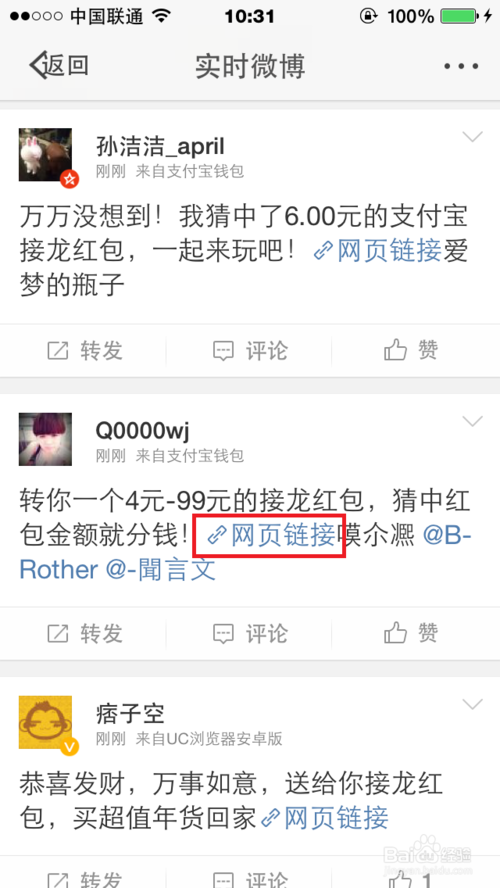 6、最近发布的红包接龙信息出现,点击【网址链接】,开始抢红包。