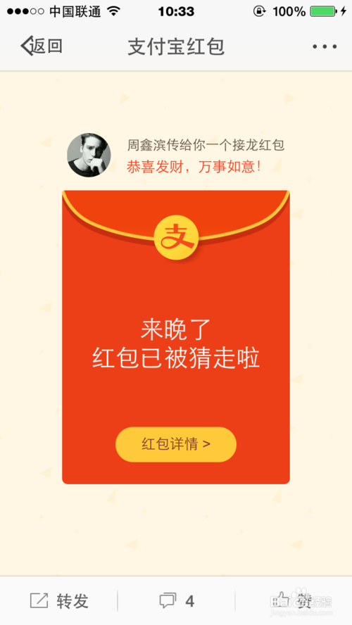 7、点击红包链接之后,进入红包页面开始抢吧。拼手速的时候到了。小编手速略慢,红包被抢光了。刷新急需搜索红包~~~