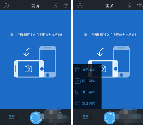 点中间的蓝圈会有文字、照相和爆料选项,选择照相会直接出现拍照功能,选左下角里面的横屏模式,可以直接拍,也可以到相册中选照片,很方便。