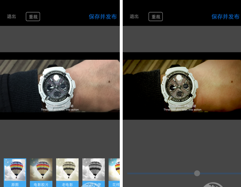 加完文字,选择适合的滤镜,点保存并发布,其实就相当于社交应用的分享,只是把照片分享到这个App中,照片会自动存储在照片库中。同时也可以分享到包括微信、微博等社交工具。想象一下,发一组自己的电影大片在朋友圈秀一秀,绝对会有很多人点赞。