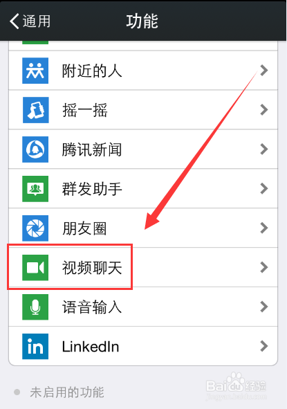 然后找到【视频聊天】这个选项,并且点击打开。如下图所示。