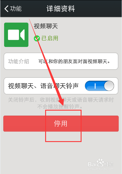 如果希望停用视频聊天功能,则点击红色的【停用】按钮即可。如下图所示。