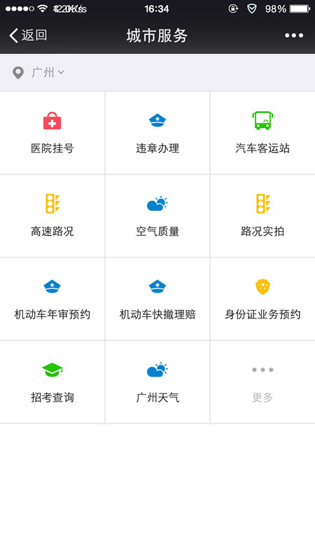 功能图标出现,点击“更多”可以看到全部功能。例如点击“路况实拍”可以让你有机会知道各个路段的交通实时情况。