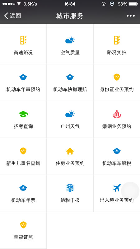 首批上线的服务包括:医院挂号、违章办理、车管所微服务、交通限行查询、PM2.5查询、水费缴纳 、快速理赔、旅游联卡年票售卖、12315投诉、考分查询 、车辆年审查询、发票查询、天气查询等14项。