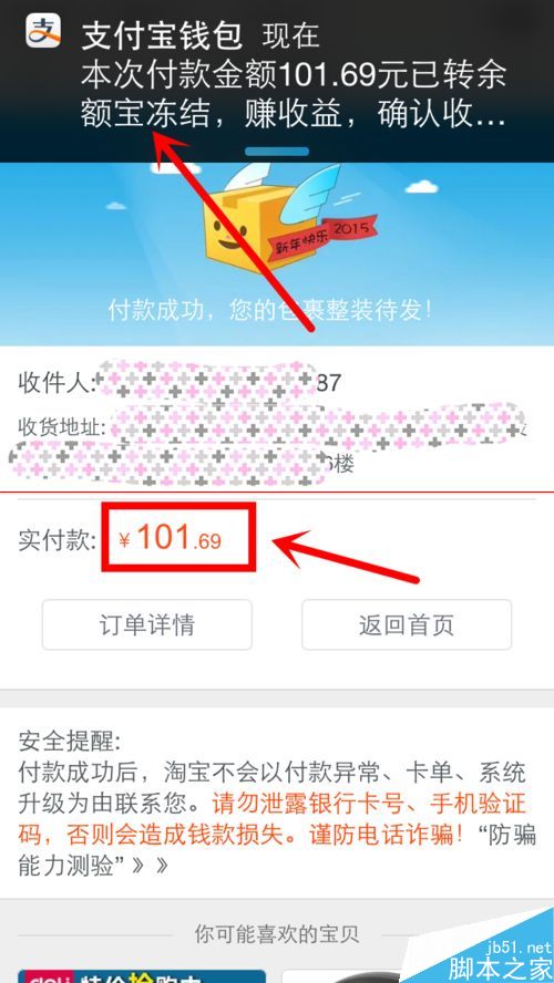 7、返回你的账单,你可以查看到,你的付款方式为余额宝分期付款。如图所示。以上就是在手机上用余额宝分期付款的详细步骤。