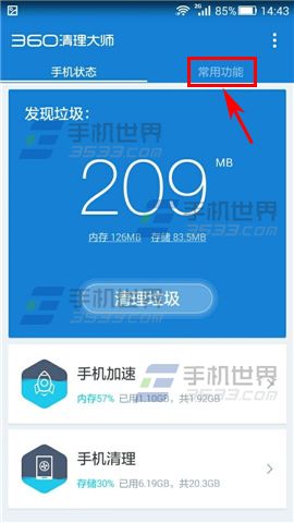 1)打开360清理大师,进入【常用功能】栏;(如下图)