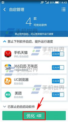 2)点击【自启管理】,360清理大师会自动为你分析哪些应用是没有必要开机自启的,你只需点击【优化】就可以了。(如下图)