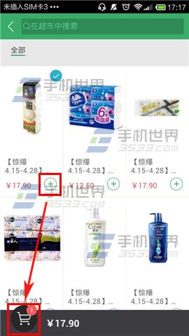 2)在某个超市列表中,选择想要购买的【产品分类】看中有喜欢的宝贝点击【+】按钮,选择好后呢点击【购物车】。(如下图)