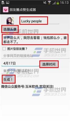 2)打开【朋友圈点赞生成器】然后输入【微信用户名】,【选择头像】填写【朋友圈内容】再勾选【图片型朋友圈】然后选择【发布日期】,再选择【集赞个数】最后点击【生成】;(如下图)