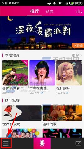 1)打开【咪咕爱唱】,进入首页后点击左下角的三道杠【三】。(如下图)