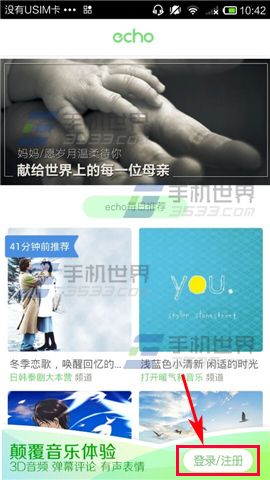 1)打开【echo回声】,进入首页后点击【登录/注册】按钮。(如下图)