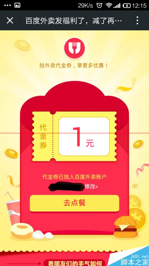 1、首先先注册一个百度账号,这是必须要得。打开百度外卖手机软件(电脑也可以),进行订餐,找你熟悉的餐厅或朋友知道的,以免菜色不好或其他原因。付款后,就会出现红包页面,有100元红包。点击分享,可以几个吃货建一个群,一起领红包。