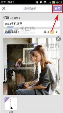 2)弹出选项,点击【发帖】一项,输入帖子标题、照片以及文章内容后,选择好类别即可点击【发布】。(如下图)