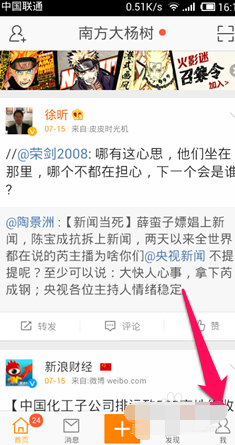 1、在手机里进入到微博,选择我的。