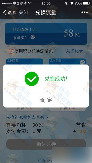 3、然后兑换流量包到手机(移动用户可以兑换1次30M+2次10M;电信直接兑换50M)