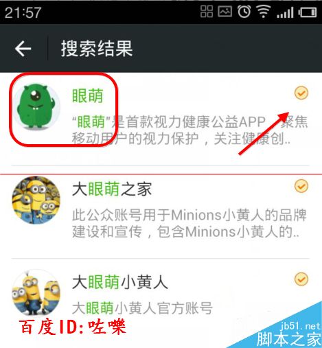 3、在搜索结果中找到 眼萌公众号(注意是腾讯公司的那个),如图就是第一个啦