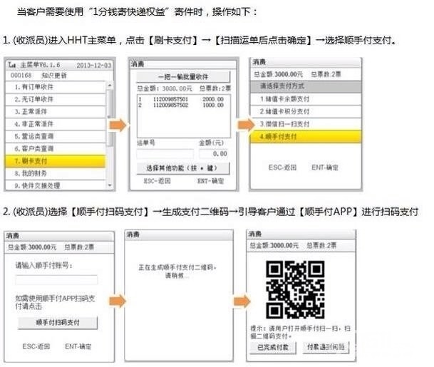 就像平常寄快递一样,打电话或者网上下单叫快递员上门收件,填好地址后,告诉快递员你要用顺手付一分钱付快递费,快递员知道后会用他的像POS机一样的扫单器生成一个二维码给你扫描支付。我碰到的这个快递员刚好知道这个活动,所以很顺利的扫码了 。但是有些快递员不知道这个活动,你可以要他打电话问问顺丰客服要怎么操作,我这边截了个图给大家参考一下。